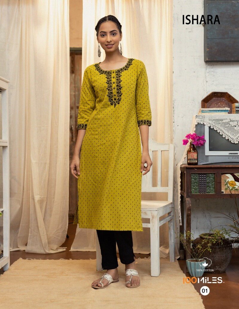 - Price: You can buy 100 Miles Ishara Cotton Kurtis Catalog at Wholesale Rate full catalog at wholesale price ₹1,407 and weight of catalog is 4 KG