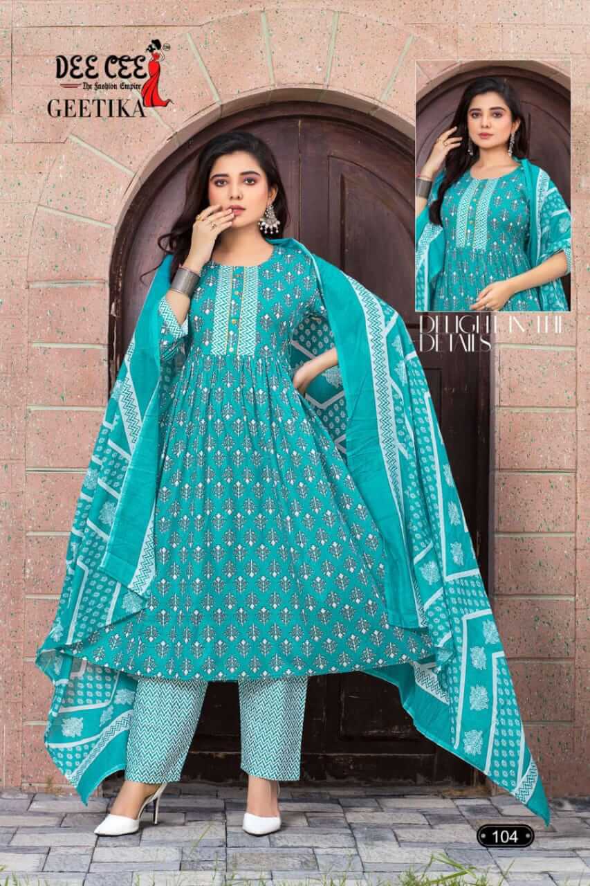 - Delivery: Estimate delivery time would be 5- 7 Working days. Dee Cee Geetika A Line Kurti with Pant and Dupatta Catalog at Wholesale Rate Can be delivered all over in Surat and all part of India. We deliver in Bangladesh, USA, UK, Australia, Saudi Arabia, Fiji etc, World Wide shipping