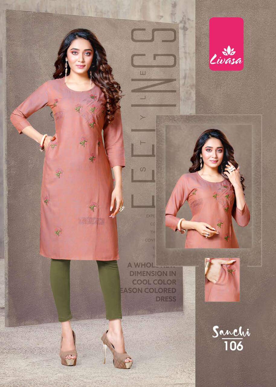 - Price: You can buy Livasa Sanchi Rayon Kurti Catalog At Wholesale Price full catalog at wholesale price ₹3,083 and weight of catalog is 3 KG
