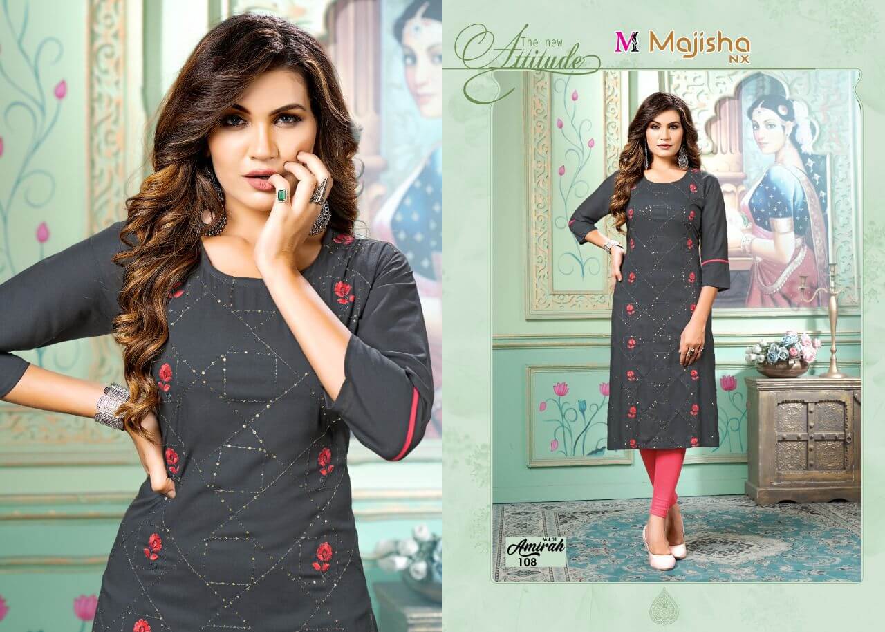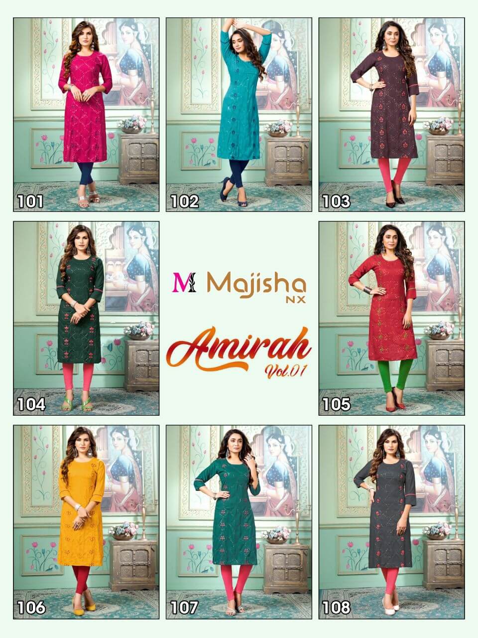 - Delivery: Estimate delivery time would be 5- 7 Working days. Majisha Nx Amirah Vol 1 Straight Cut Kurti Catalog At Wholesale Rate Can be delivered all over in Surat and all part of India. We deliver in Bangladesh, USA, UK, Australia, Saudi Arabia, Fiji etc, World Wide shipping