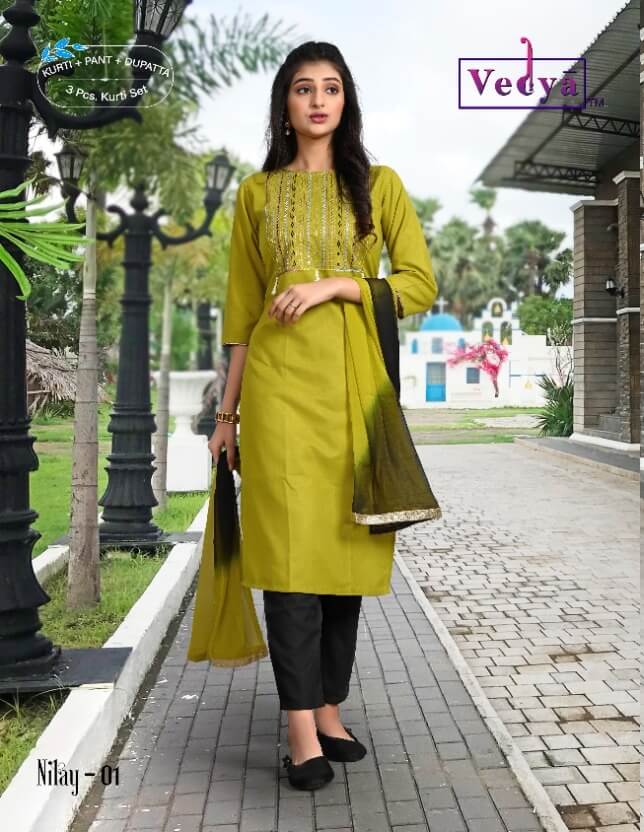 - Price: You can buy Vedya Nilay Cotton Embroidered Readymade Dress Wholesale Catalog full catalog at wholesale price ₹2,898 and weight of catalog is 3 KG